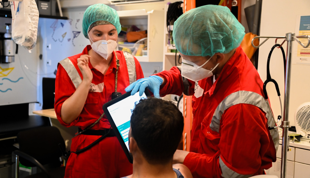 Introducing the app: The medical team uses the Care to Translate app during rescue missions. Its offline functionality is crucial for unreliable internet at sea, and standardized lists streamline medical check-ups.